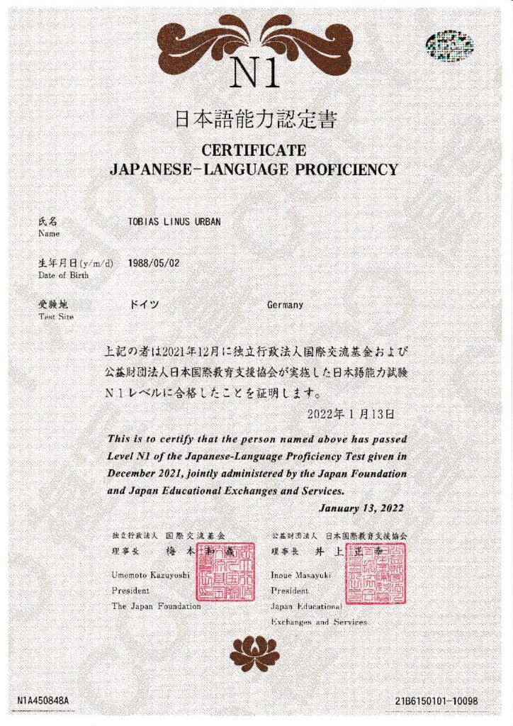 - Ich erreichte das höchste japanische Sprachzertifikat (Japanese Language Proficiency Test, Level N1)